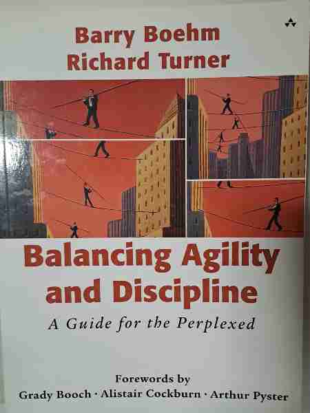 Balancing Agility and Discipline is a book written in 2004 by Barry Boehm and Richard Turner. The fact that it is already on its 6th reprint tells something about its value. This is a very pragmatic book that tries to put in perspective agile and plan-driven software development approaches.